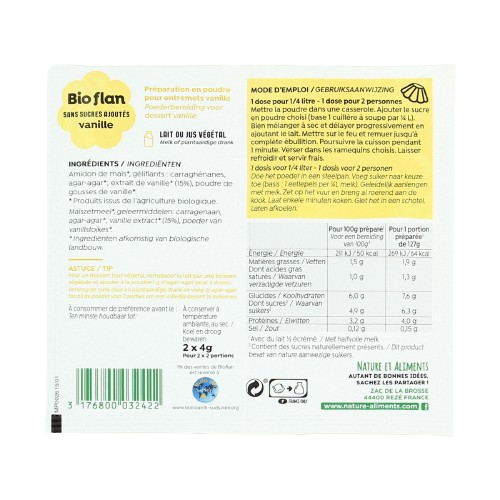 تم تصنيع بيوفلان المعتمد عضويًا من قبل FR-BIO-01 بعناية باستخدام مكونات عضوية عالية الجودة فقط. بدون إضافة سكر أو جلوتين أو لاكتوز، ومعبأ في ورق قابل لإعادة التدوير بنسبة 100%، صحي تماما كما هو لطيف على البيئة.