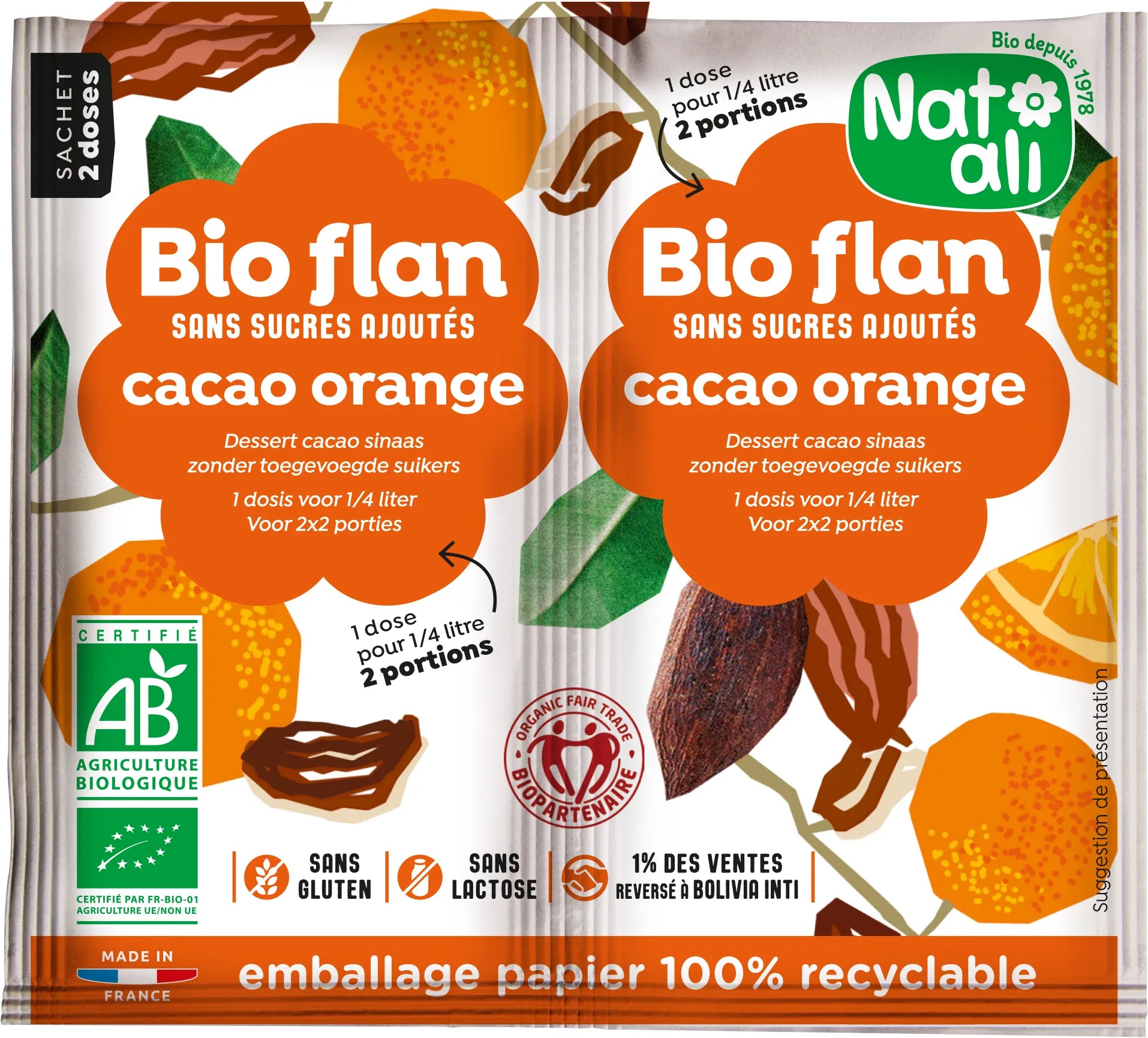 Experience the unique combination of rich cocoa and zesty orange with our Organic Cocoa Orange Flan. Certified organic by FR-BIO-01, this dessert mix is gluten-free, sugar-free, and free from animal-based ingredients. With a Planet Score A, it’s a perfect choice for a delicious, eco-friendly dessert.