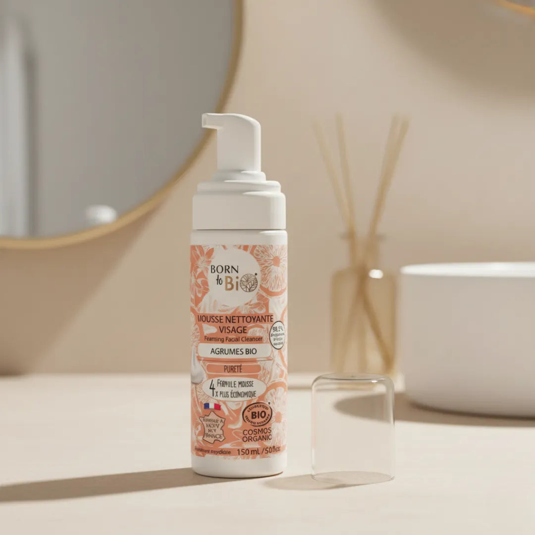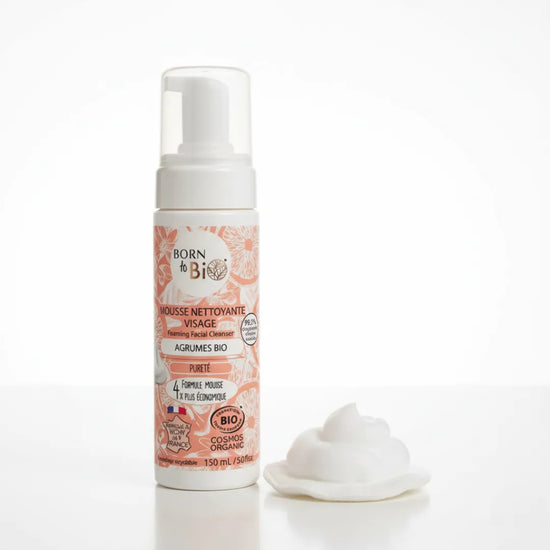 Discover the organic face cleansing foam in a 150 ml pump bottle. This amount is equivalent to approximately 200 doses.